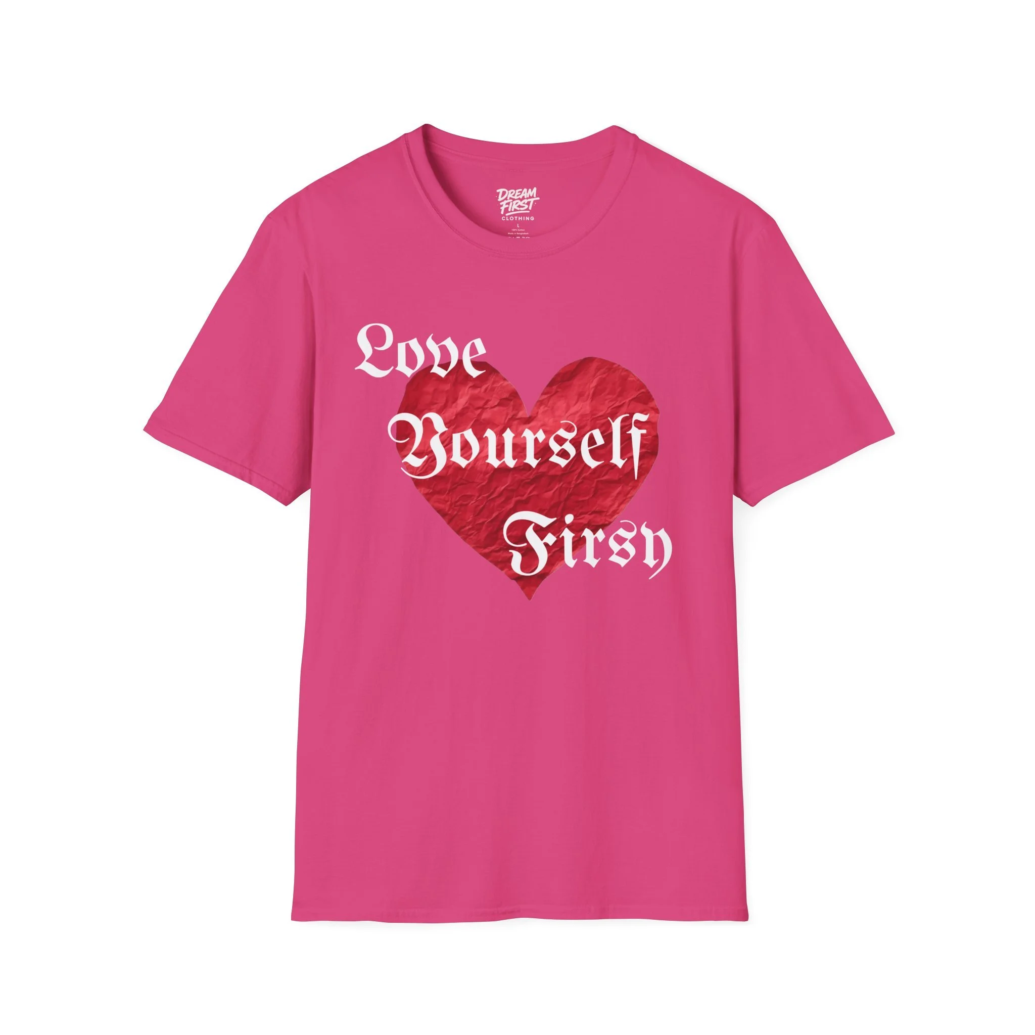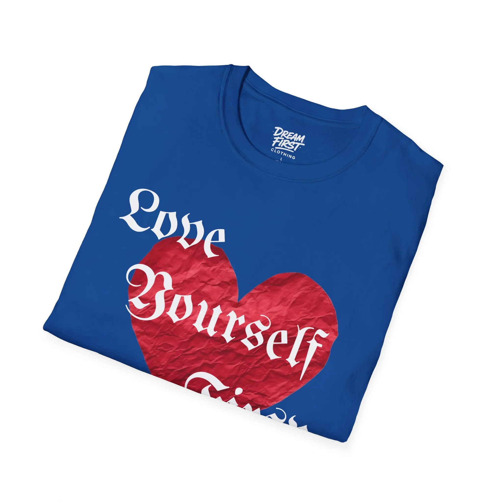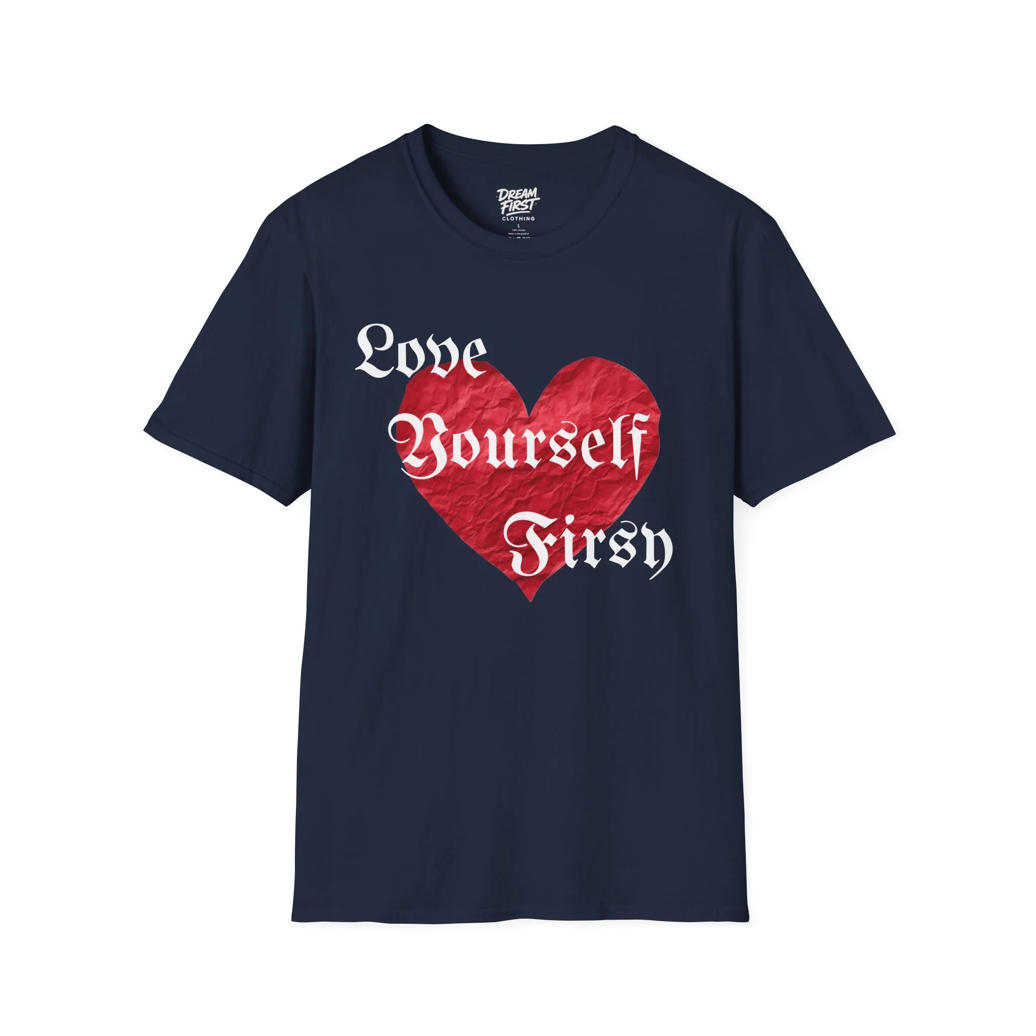 This lightweight crewneck tee carries a bold, heartfelt message: a textured red heart at center with vintage Gothic lettering reading “Love Yourself First.” It sits on a soft, smooth cotton body that drapes cleanly and feels airy all day. Wear it when you want to walk out with a quiet confidence — whether you’re running errands, meeting friends for coffee, or layering it under a jacket on a cool evening. It has a durable print that will hold up wash after wash. It’s simple, direct, and made to remind you — and everyone who sees you — to put your own care first.