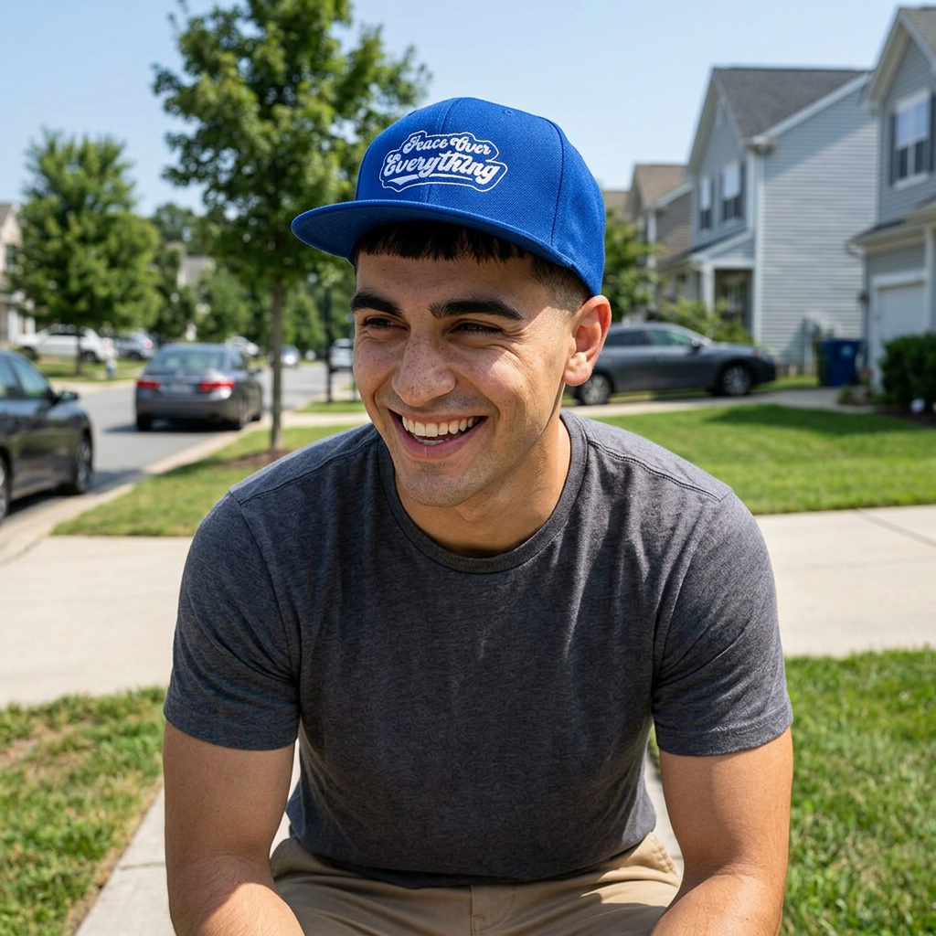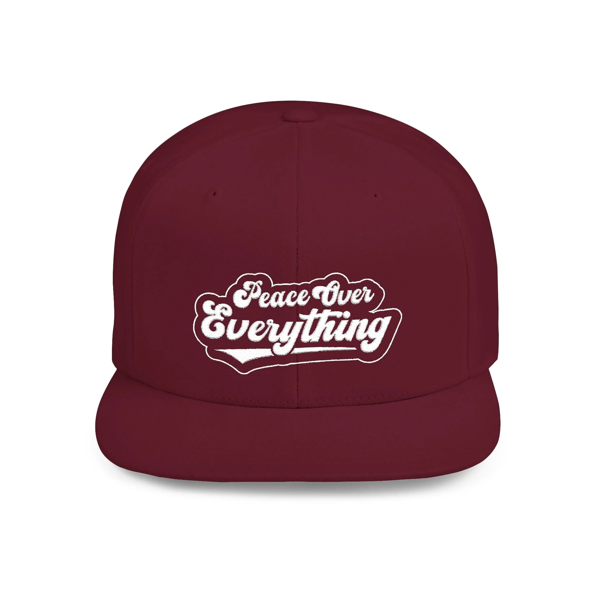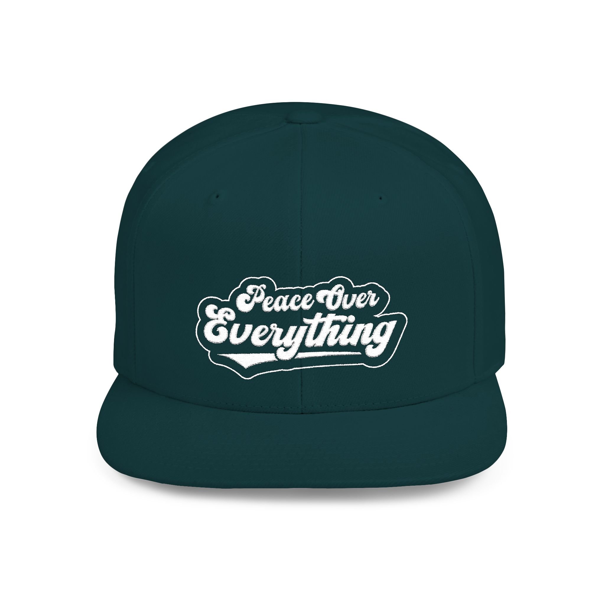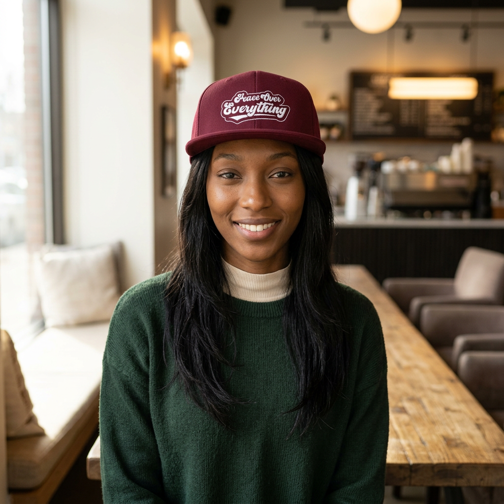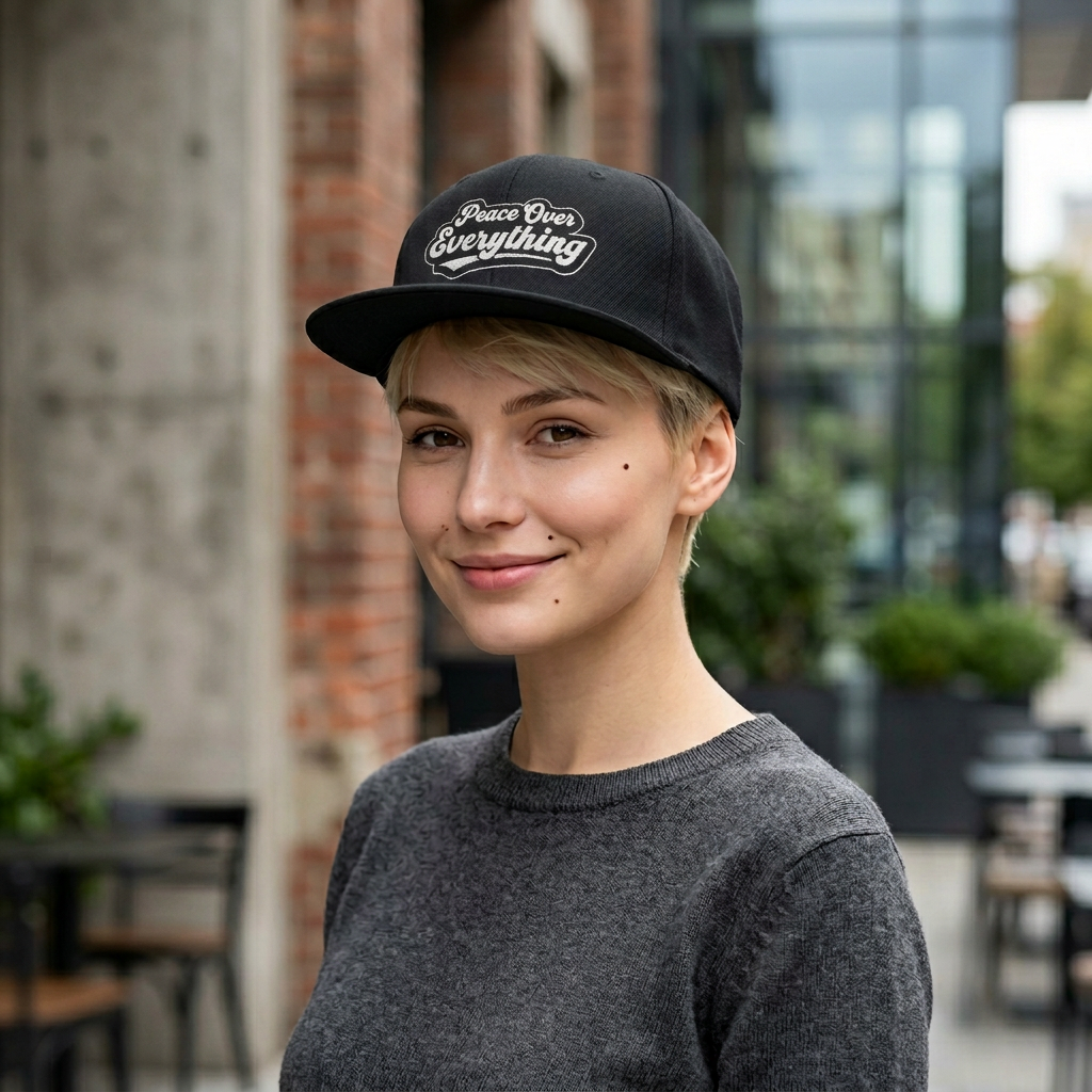 A structured, high-profile flat bill snapback with a raised white embroidery that reads “Peace Over Everything.” The cap’s flat visor give it a classic streetwear edge, while the six-panel construction, embroidered eyelets, and eight-row stitching add durability and shape. An adjustable plastic snap closure lets you dial in the fit, and the sewn-in label and visor sticker keep the authentic cap feel. Lightweight yet sturdy (80% acrylic / 20% wool for most colors), this snapback layers easily over hoodies or tees and brings a calm, confident vibe to everyday wear — from workout sessions and festivals to slow afternoons at a coffee shop or to wear for evening walks.